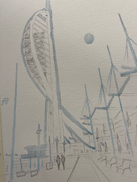 This is the drawing so far and even this took some working out. There was an awful lot of masking out to do. The tower itself has had to be protected as the night sky will be darker than the colour chosen for the tower itself.