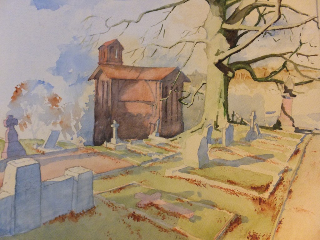 This is the painting of the Watts Chapel that I did once, built in brick and shaped like a Greek cross. The interior is beautifully designed in Arts and Crafts style. The bricks were made locally in Mary Watts works