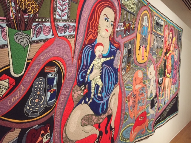 Excellent exhibition on at the moment until June, featuring colourful tapestries designed by Grayson Perry and woven in Belgium. They echo the Rakes Progress series of paintings by Hogarth depicting the hero Tom Rakewell squandering his fortune on riotous living and plunging into debt and madness. The hero of the tapestries is Tim Rakewell, who becomes a computer genius, makes a fortune and moves socially upward. His nemesis comes when his luck affects his judgement and going too fast, drives his powerful car into a lamp post and goes through the windscreen. he was not wearing a seat belt. He dies at the roadside. As the attending medic says” with all his money and he dies in the gutter”