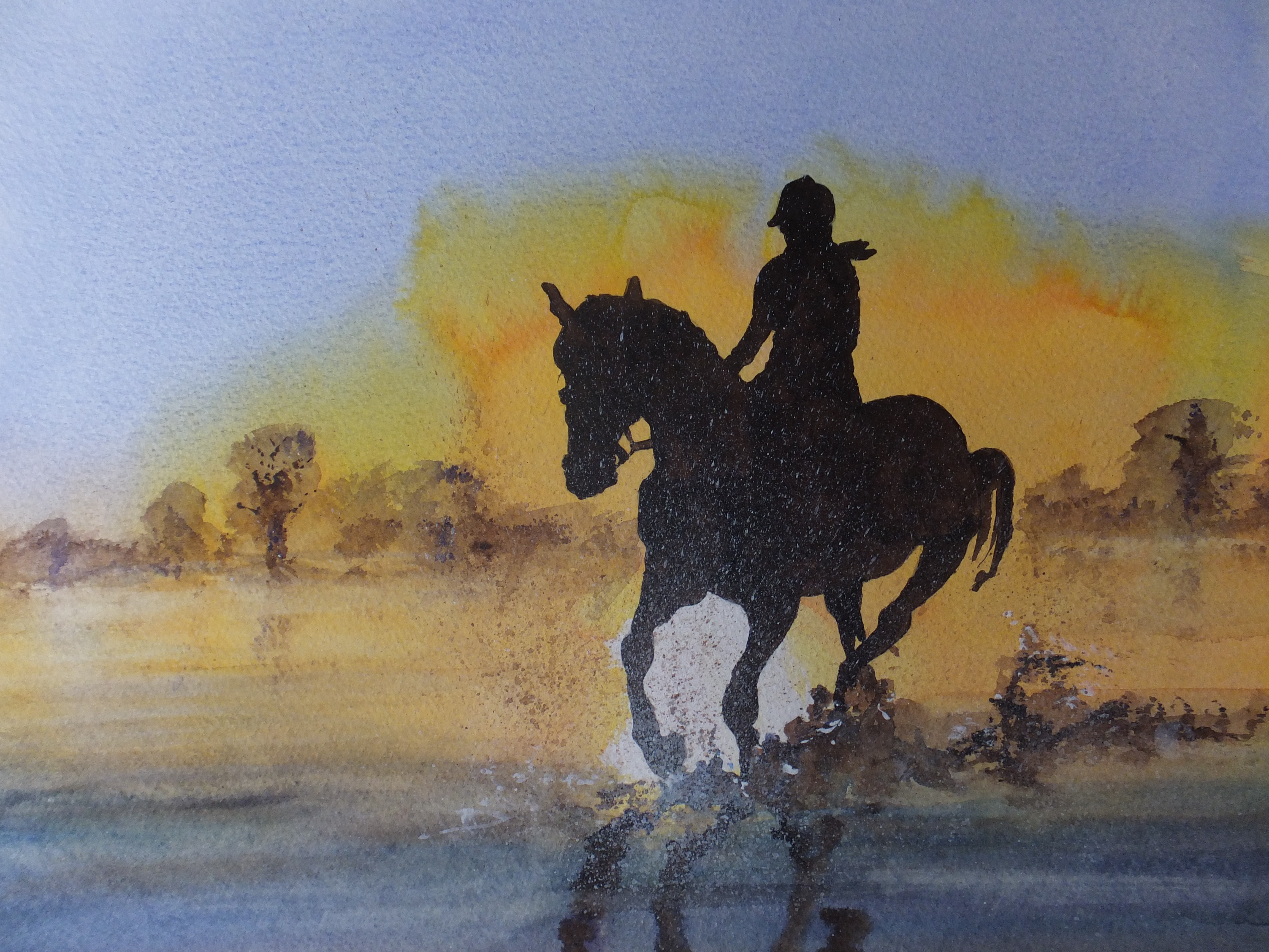 I came across the attached photograph a few months ago, which interested me. As you can see, it is a gentle evening shot, with some bright sky and some very deep silhouettes. The details are blurred, which is not something I usually do, but found myself intrigued nonetheless. The effect could be impressionistic, which again is not something I usually do. The other thing I liked, is that, when translating this into a painting, one could use a very limited pallette, which I find improves the effect very often. In this case, we are looking at yellow and violet basically, which generally work together very well.