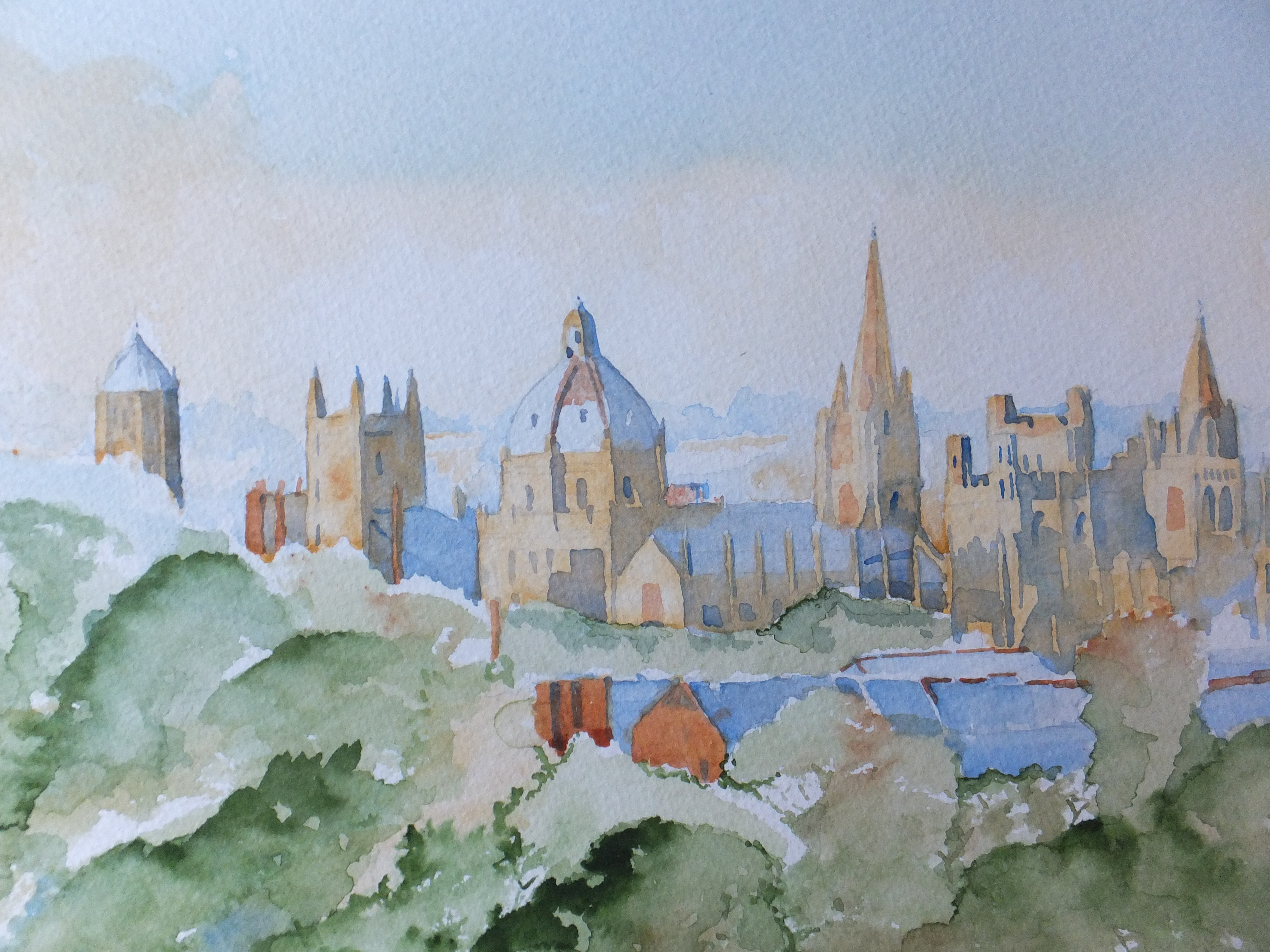 Our grandson went up to Oxford about a year ago. He sent us a postcard during his first term. The view was of the dreaming spires which was an ideal picture for painting. All those old favourites, Tom Tower and the Ratcliffe Camera plus a few that I’ve forgotten