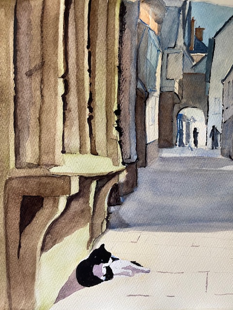 I had it in mind as a possible painting at the time, and reminded about it recently, decided to do it. I quite liked the result, as I don’t usually do cats. I used a mix of raw sienna and naples yellow for the pavement. I have a favourite mix for black, which gives a glossy black which is good for animal fur or feathers. This is a mix of blue like Windsor Blue and Alizarin crimson, with a dash of Sepia or Burnt Umber. You don’t need much of the dark brown, and that bit is pure trial and error