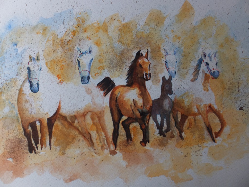 When I posted this painting previously I thought the horses were floating which was not an effect that I had been trying to get. It was suggested that I add spatter so that it would appear the horses were kicking up mud. So that is what I have done, and I prefer the result. They do now look as though they have feet on the ground