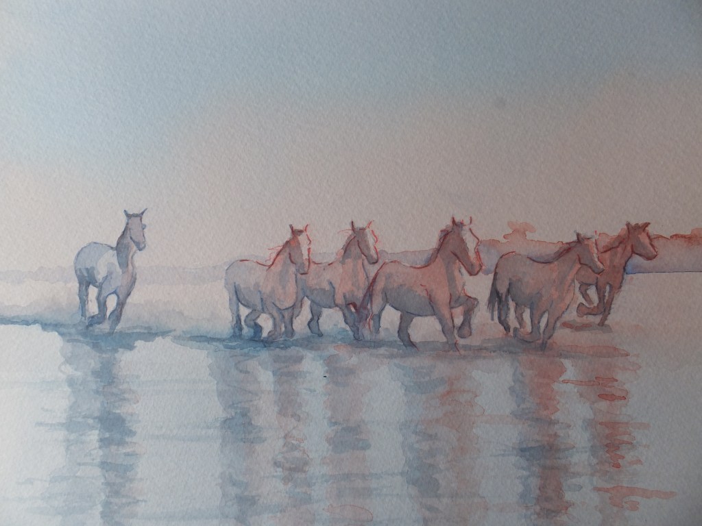 I have managed to keep to a rather limited palette. Cadmium Yellow which I mentioned before and Ultramarine Violet, together with Transparent Brown which I softened with Violet. This is still my favourite shadow colour. I used Vermilion for some distant red clouds behind the trees, and also for the red paint along the hull of the hulk on the beach.