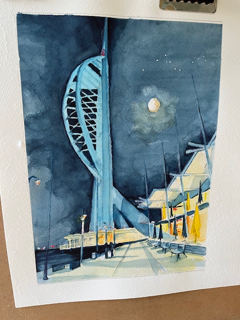 I used indigo for the night sky and introduced cloud and the moon to make it more interesting. An occasional dab of black where I wanted the sky to be really dark. Quite a lot of masking out on this one. The tower itself for one which was a big job, plus the gables over the restaurants. Also I had to do a lot of lifting of colour for example to produce the tall poles which are shown in deep shadow on the photograph. They worked well. I was pleased from some of the comments afterwards that the mood created was what I was trying to get. Some drama and some romanticism, bearing in mind that this was someone’s special place