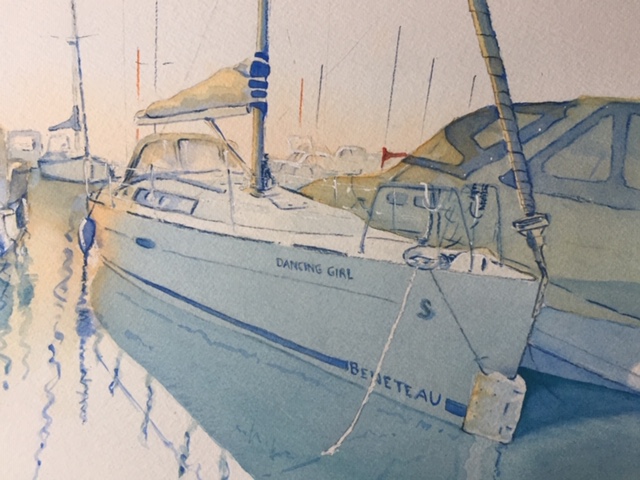 In the shadow of the nearest boat, I would like to see more red, which won’t necessarily be correct, but I would like relief from the grey. I have tried to convey the sun catching the stern